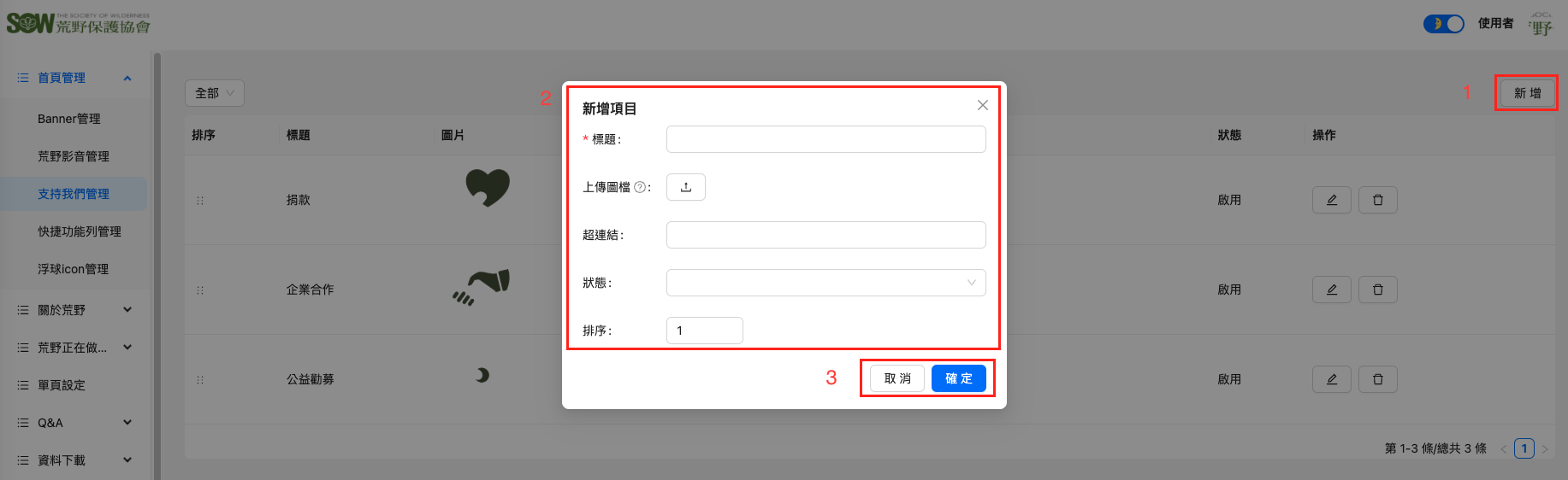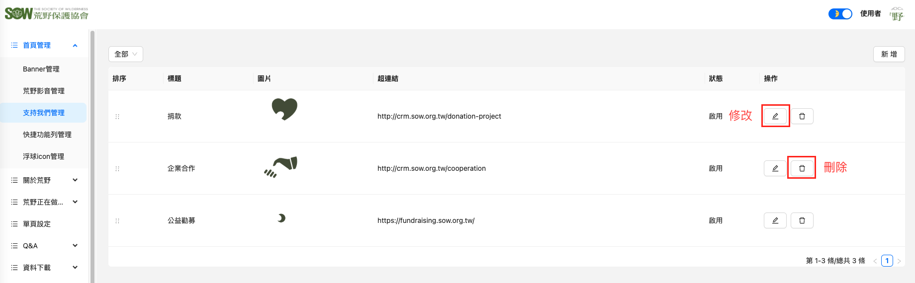在列表頁選取『修改鈕』或『刪除鈕』(如下圖示意),即可執行動作。