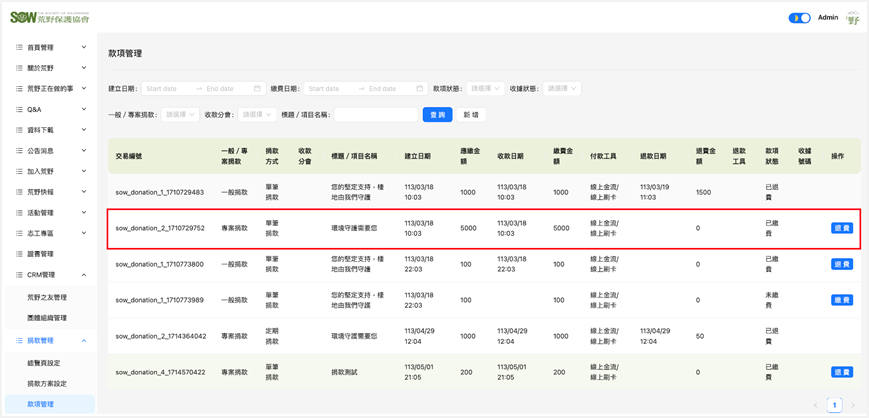 (二)查看與編輯 點2下列表頁的捐款資料列,即可查看該筆捐款的詳細資料,點選編輯,即可針對該筆捐款資料進行修改。 當款項狀態為已繳費,僅能修改收據資訊(紙本收據寄發方式、地址、捐款名義、收據張數、徵信刊登、收據資訊、捐款備註)等欄位。 當款項狀態為未繳費,可編輯所有欄位。 款項狀態為已退費,僅能修改退費分會、退費原因、備註/說明。 捐款資料頁(尚未完成)