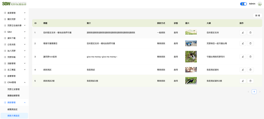 | 一般/專案捐款 | 顯示該筆捐款方案是:一般捐款或專案捐款 一般捐款僅有1個,僅能修改內容,不得刪除。 |