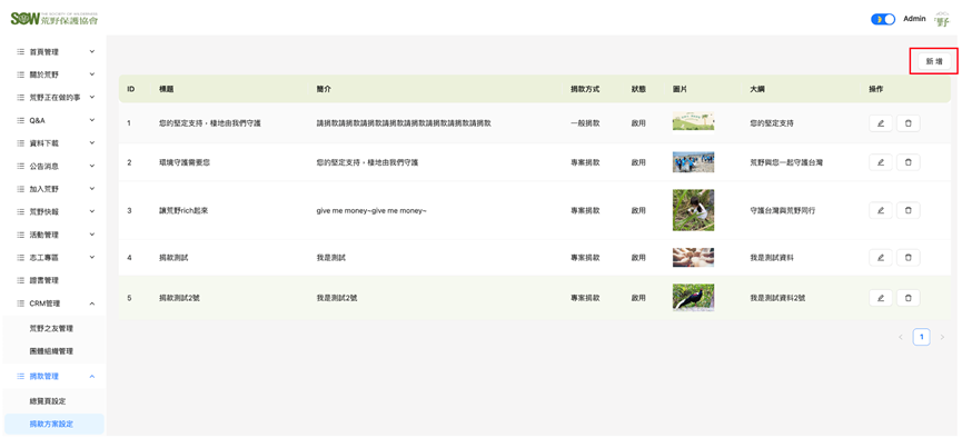 | 狀態 | 顯示該筆捐款方案的狀態是:啟用、停用 |