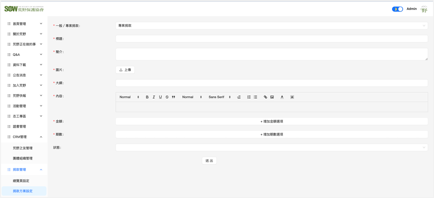 完成內容設定後,點選送出,系統在狀態為啟用,且上架時間到的時候,會將該捐款方案顯示於使用者前台。