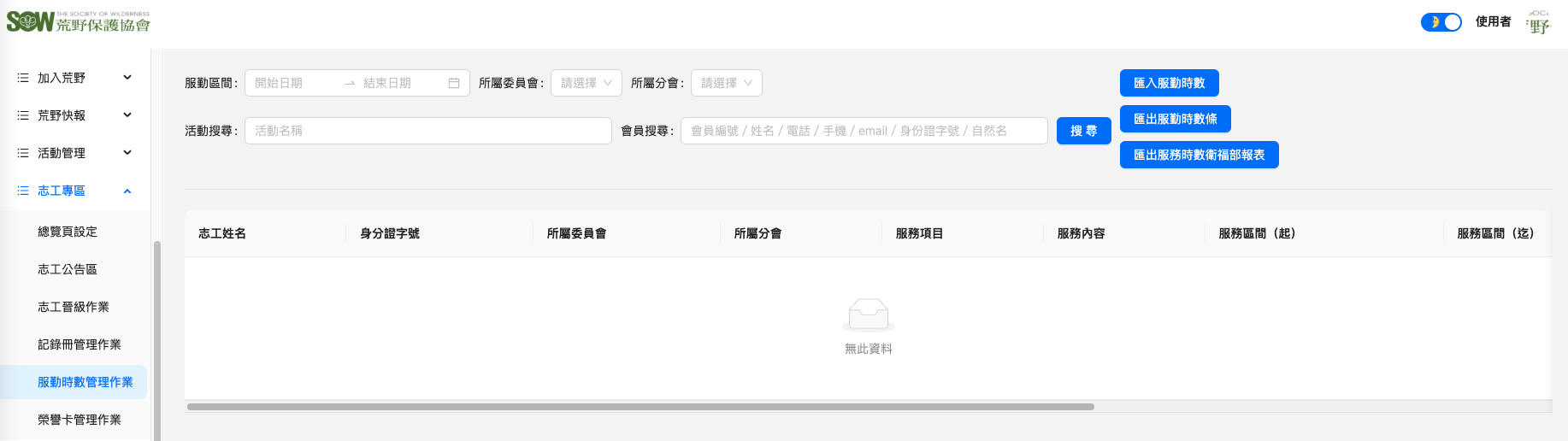 | 所屬分會 | 下拉選單 | 管理者可依志工的所屬分會篩選志工的服勤紀錄。資料來源:荒野分會管理作業 |