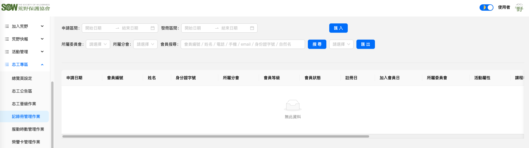 | 所屬分會 | 下拉選單 | 管理者可依據有點選『申請政府志工記錄冊』的所屬分會篩選志工。資料來源:荒野分會管理作業 |