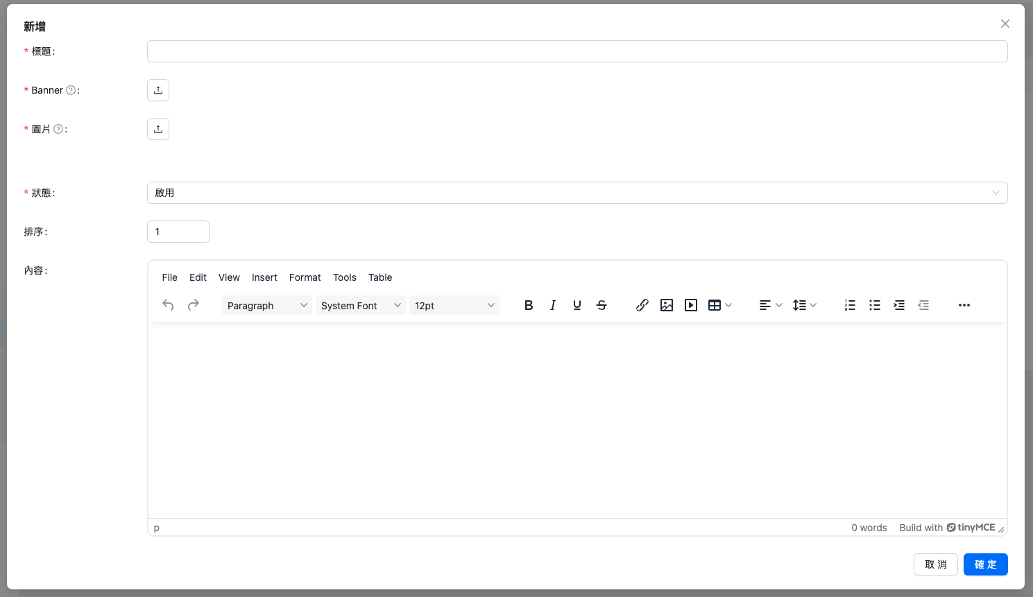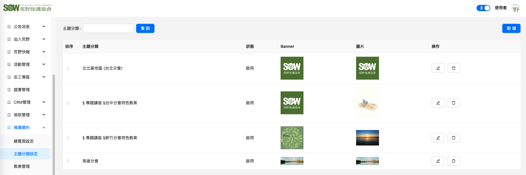 二、主題分類設定 管理者可在本功能進行『推廣邀約』的主題分類設定。 點選後,可編輯該主題分類。 點選後,將立即刪除該主題分類。 點選後,可新增主題分類。 Doc navigation← 一、總覽頁設定三、教案管理 →