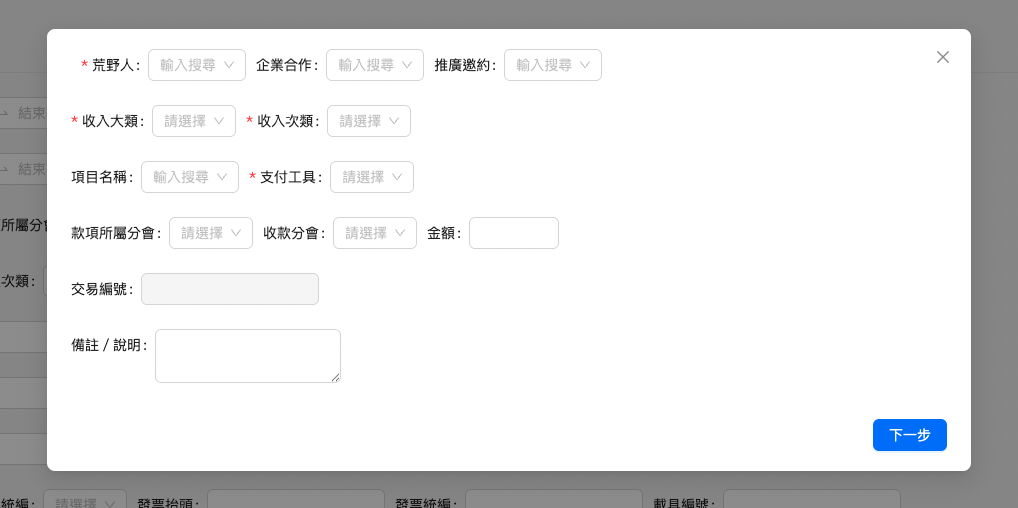 - 設定該筆收⼊所屬的收⼊⼤類、收⼊次類(非必填)、項目名稱、選用的支付⼯具、款項所屬分會、收款分會、⾦額、交易編號(支付⼯具為信用卡為必填)、備注(非必填)