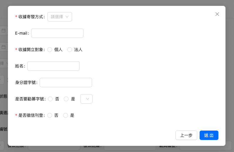 - 寄發方式:分為免寄、月寄、年寄三種,點選完成時,系統自動將收據電⼦檔發送⾄管理者所填列的 email 。