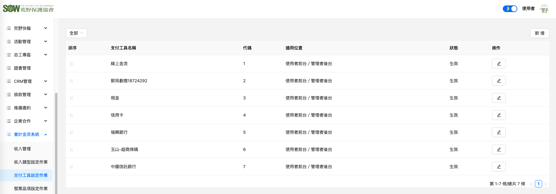 本作業設定後,提供所有前台使用者於付費時與管理者協助荒野人繳費的的支付工具下拉選單內容來源。