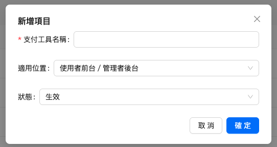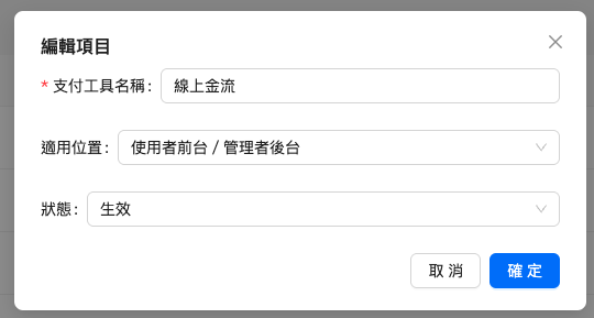 | 適用位置 | 顯示該筆支付⼯具的適用收⼊類型的前台或後台。 選項:使用者前台、管理者後台、使用者前台+管理者後台 |