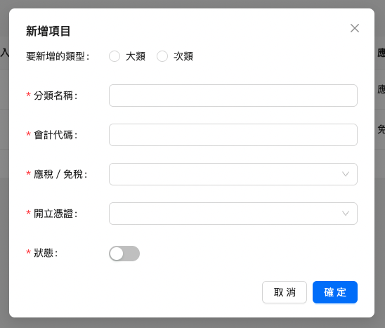 - 依據要新增的類型,輸⼊收⼊⼤類/次類名稱
