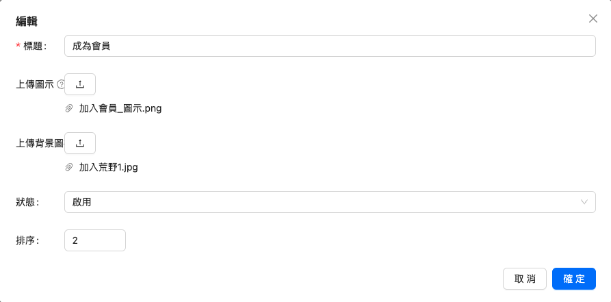 | 上傳圖示 | 設定icon的圖片 圖片規格:JPG,PNG 圖片尺寸:不限 |