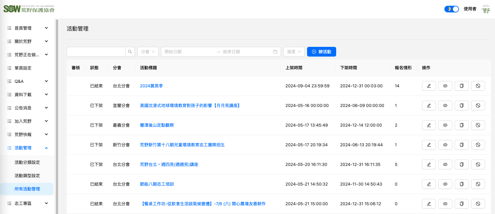 | 分會 | 提供管理者依活動辦理的分會,搜尋活動。 |