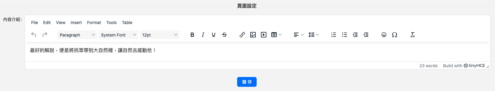 此為編輯『組織架構』點選『了解更多』後的頁面,請於編輯器上自行編輯內容,完成後點選儲存即可。