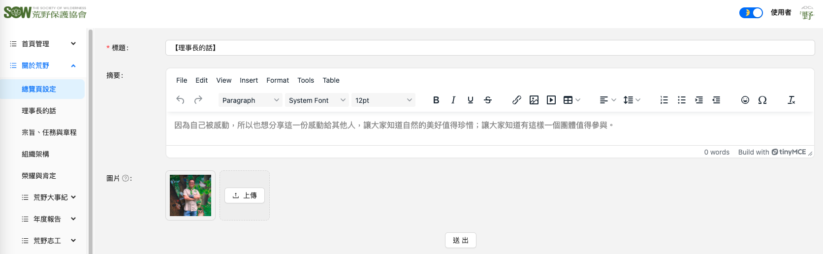 2.理事長的話 標題:編輯右側灰線上方的文字內容。 摘要:編輯灰線下方的內容(建議用文字)。 圖片:編輯灰線左側顯示的縮圖。(格式:JPG、PNG;尺寸:370px*370px) Doc navigation← 前台對應後台頁面如下:5.荒野志工 →