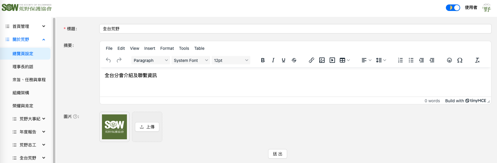 6.全台荒野 標題:編輯右側灰線上方的文字內容。 摘要:編輯灰線下方的內容(建議用文字)。 圖片:編輯灰線左側顯示的縮圖。(格式:JPG、PNG;尺寸:370px*370px) Doc navigation← 5.荒野志工