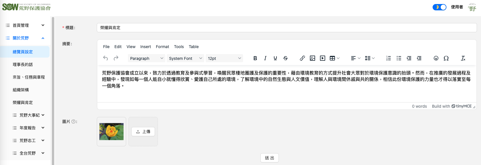 7.榮耀與肯定 標題:編輯右側灰線上方的文字內容。 摘要:編輯灰線下方的內容(建議用文字)。 圖片:編輯灰線左側顯示的縮圖。(格式:JPG、PNG;尺寸:370px*370px) Doc navigation← 5.荒野志工