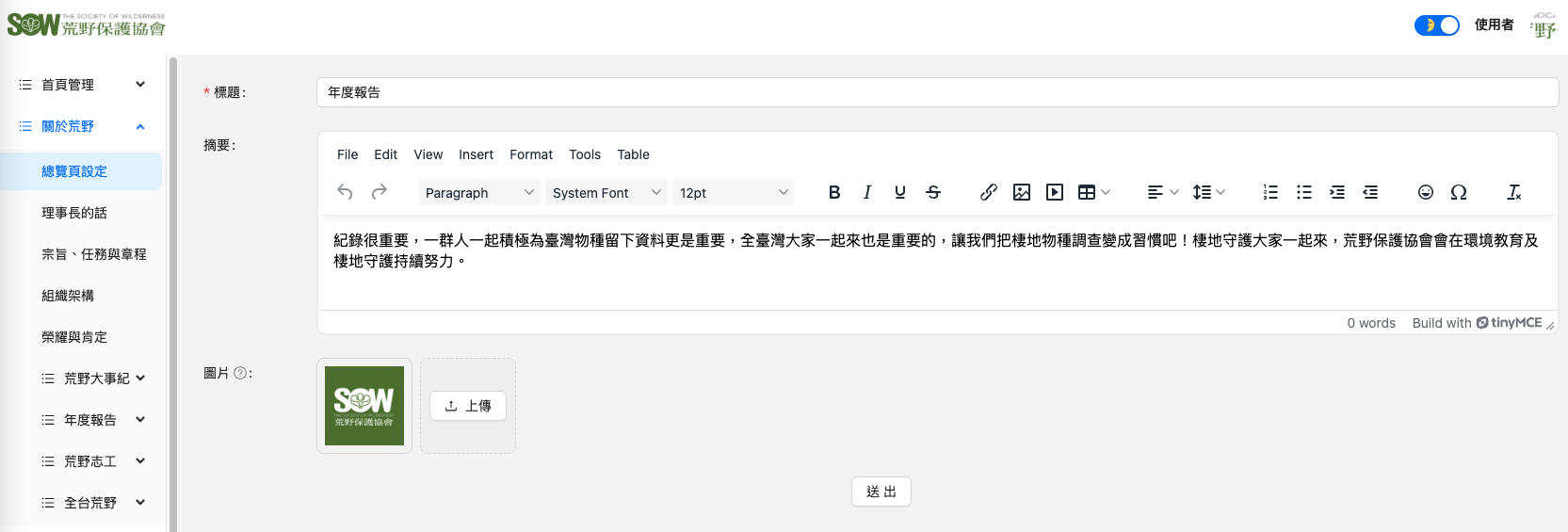 9.年度報告 標題:編輯右側灰線上方的文字內容。 摘要:編輯灰線下方的內容(建議用文字)。 圖片:編輯灰線左側顯示的縮圖。(格式:JPG、PNG;尺寸:370px*370px) Doc navigation← 5.荒野志工