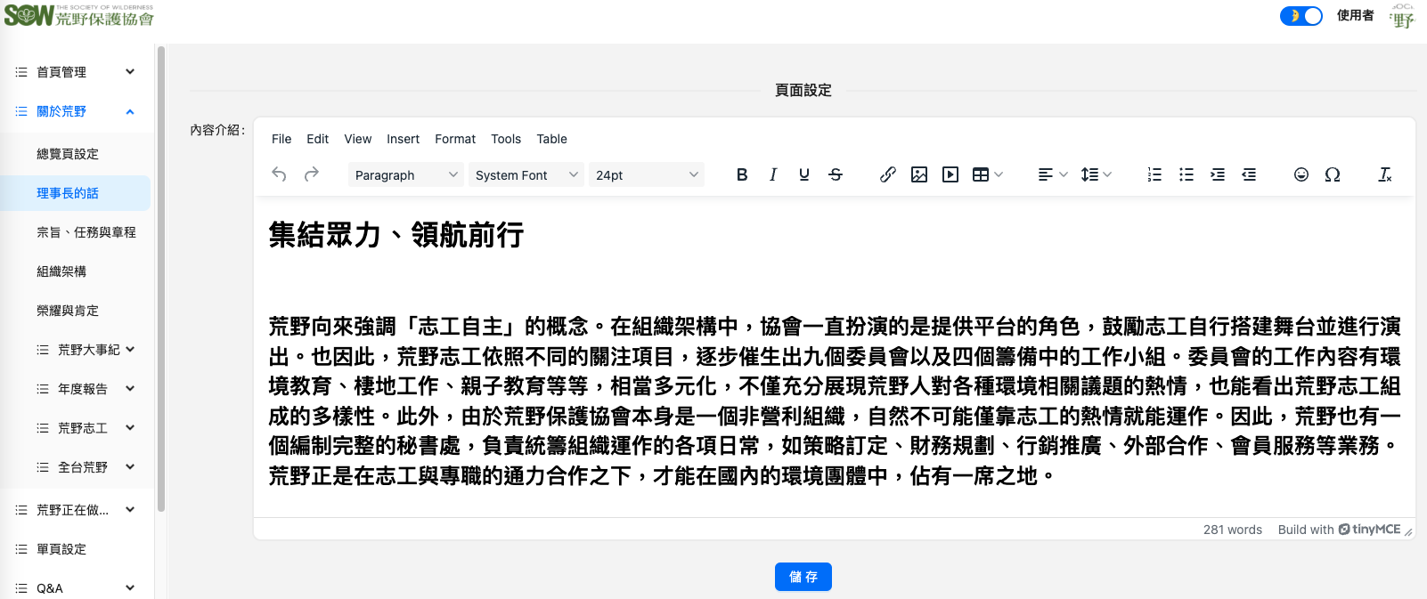 此為編輯『宗旨、任務與章程』點選『了解更多』後的頁面,請於編輯器上自行編輯內容,完成後點選儲存即可。