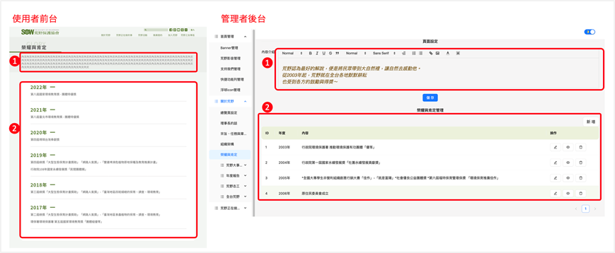 內容分成兩塊,1.榮耀與肯定的簡介2.年度事件管理,如下使用者前台與管理者後台頁面示意。