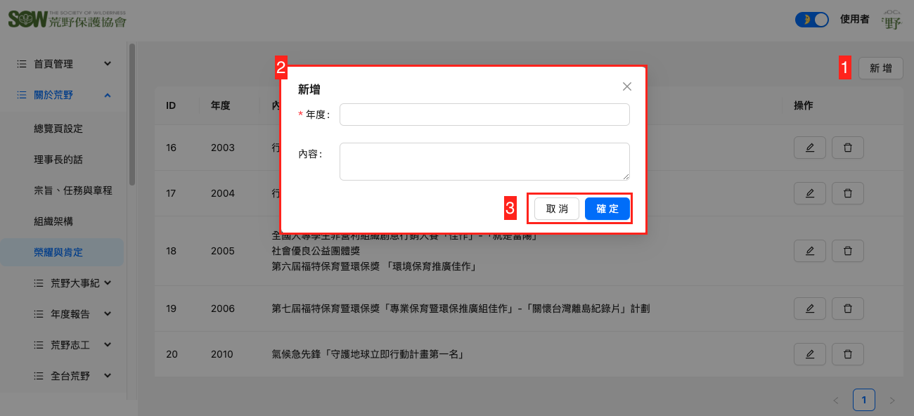 2.年度事件管理 新增事件:點選右上方新增>填列popup視窗的欄位>點選ok,即完成。 編輯/刪除事件:點選修改鈕(鉛筆)或刪除鈕(垃圾桶),即可執行動作。 Doc navigation← 1.榮耀與肯定的簡介