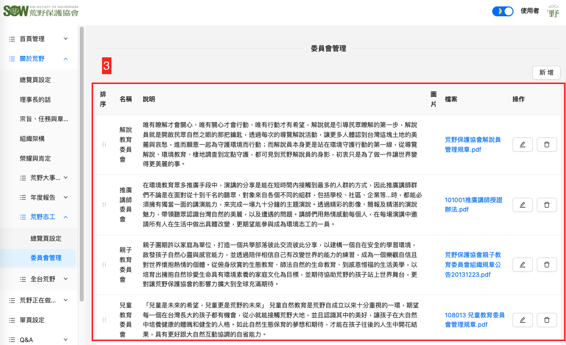 分成總覽頁設定與荒野大事紀管理兩部分管理內容,如下圖示說明: