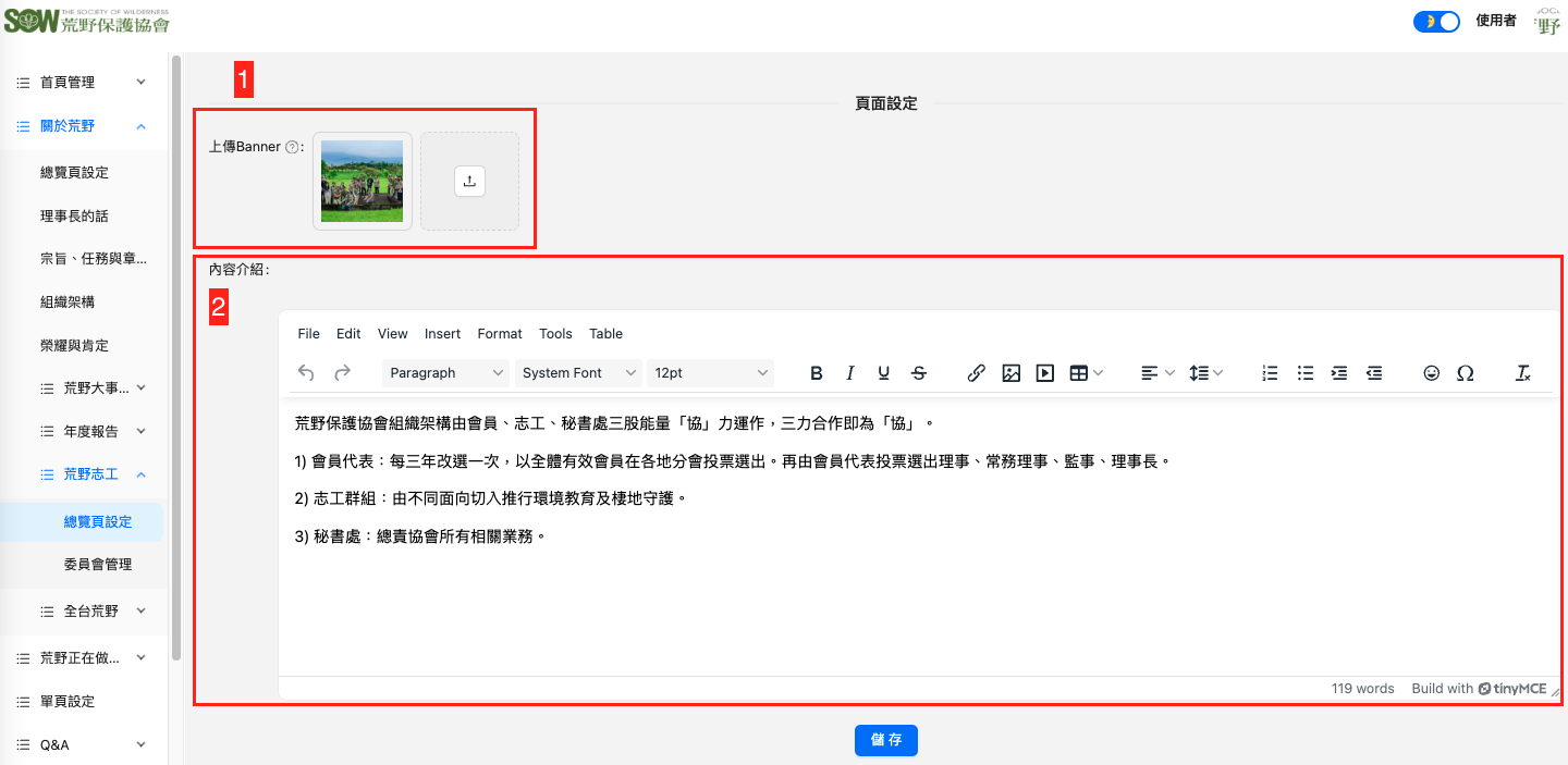 提供編輯荒野志工總覽頁上方的banner(使用者前台介面的1)與中間的介紹區內容(使用者前台介面的2)。