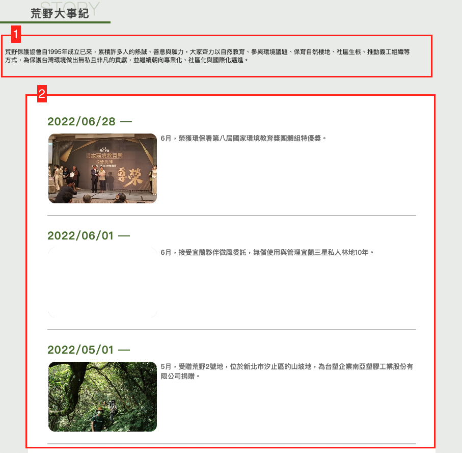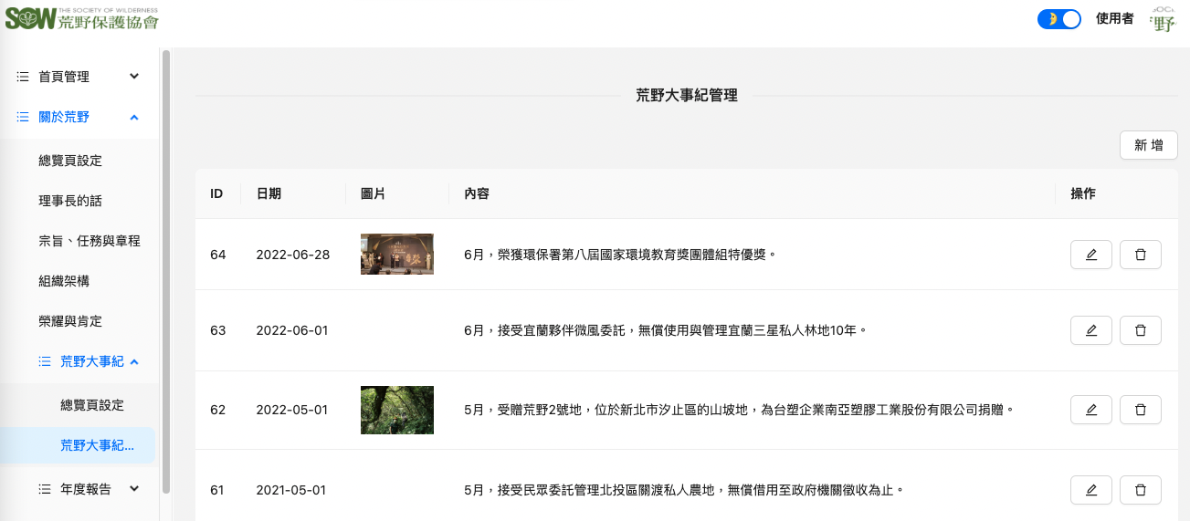 分成總覽頁設定與荒野大事紀管理兩部分管理內容,如下圖示說明: