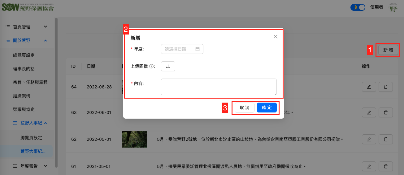 2.荒野大事紀管理 新增大事紀:點選右上方新增>填列popup視窗的欄位>點選ok即完成。 編輯/刪除大事紀:點選修改鈕(鉛筆)或刪除鈕(垃圾桶),執行動作。 (縮圖圖片格式:JPG、PNG;圖片尺寸:320px*205px) Doc navigation← 1.總覽頁設定